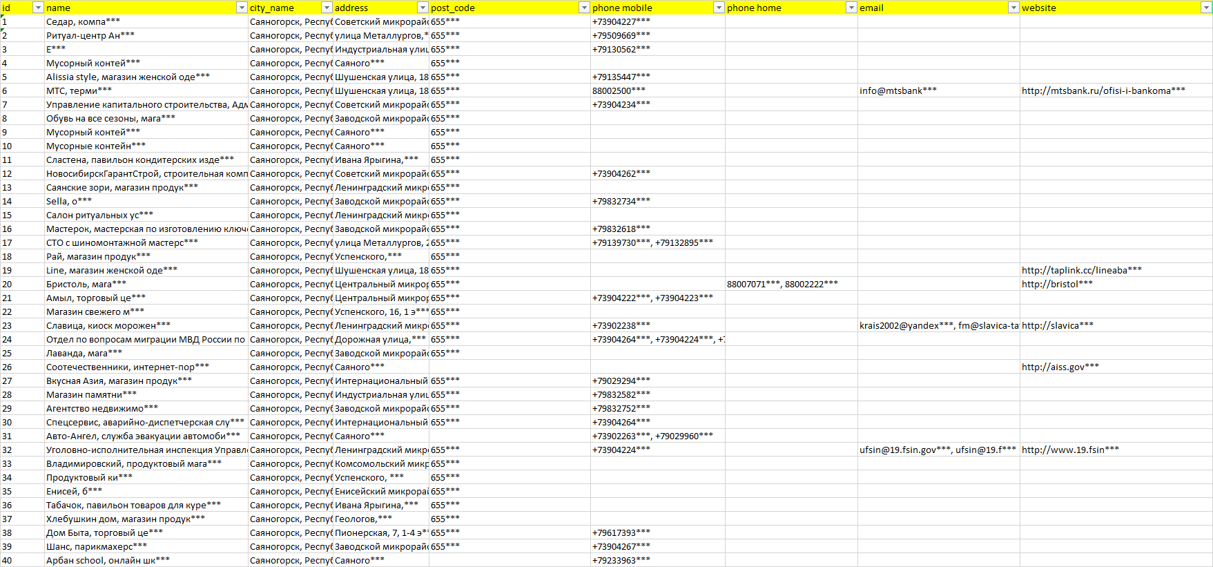 База компаний Саяногорск, вся РФ в формате Excel с эл. почтами, телефонами, сайтами, ссылками на соц сети, координатами и другой информацией. Скачайте демо версию, чтобы ознакомиться с данными.
