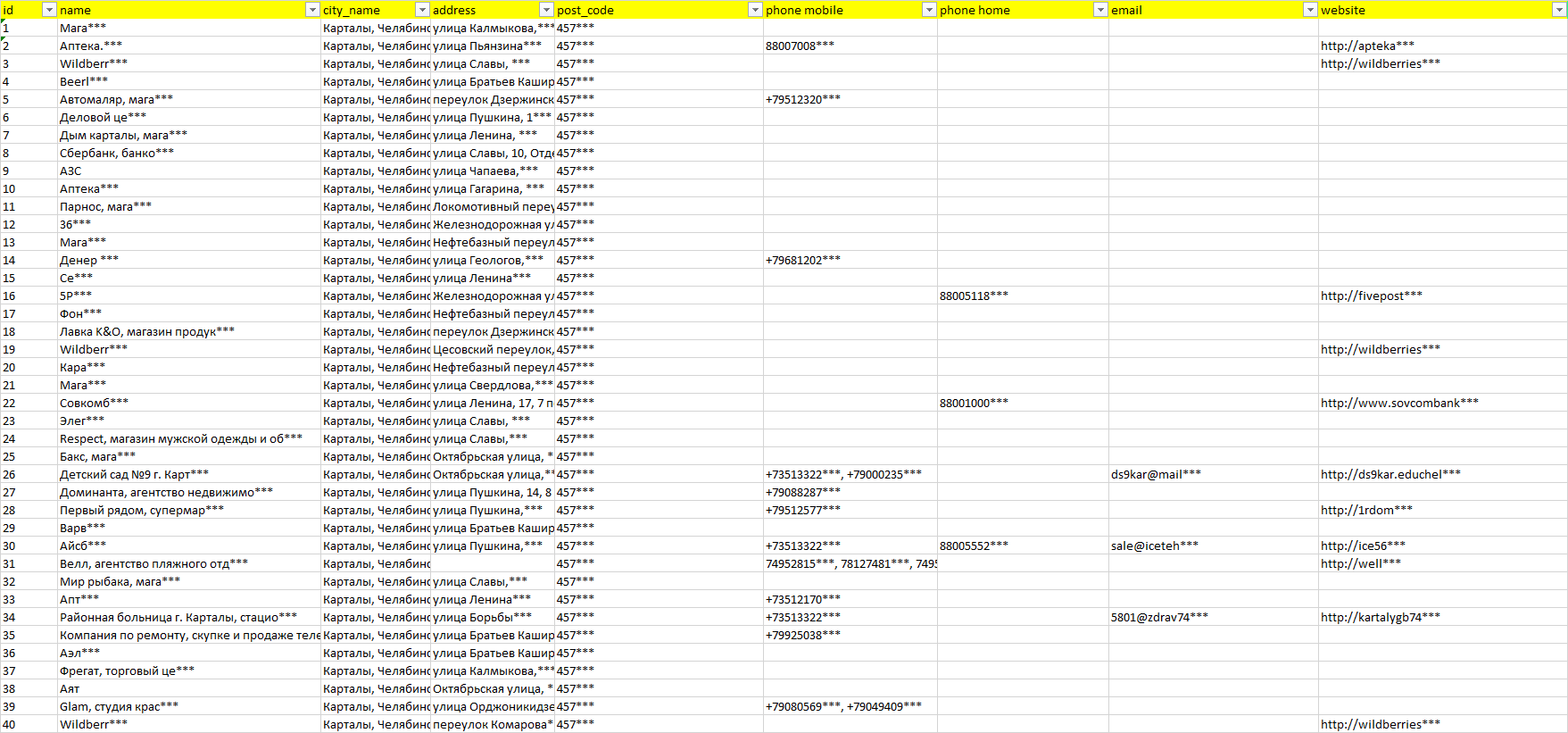 База организаций Карталы, вся Россия в формате Excel с эл. почтами, телефонами, сайтами, ссылками на соц сети, координатами и другой информацией. Скачайте демо версию, чтобы ознакомиться с данными.