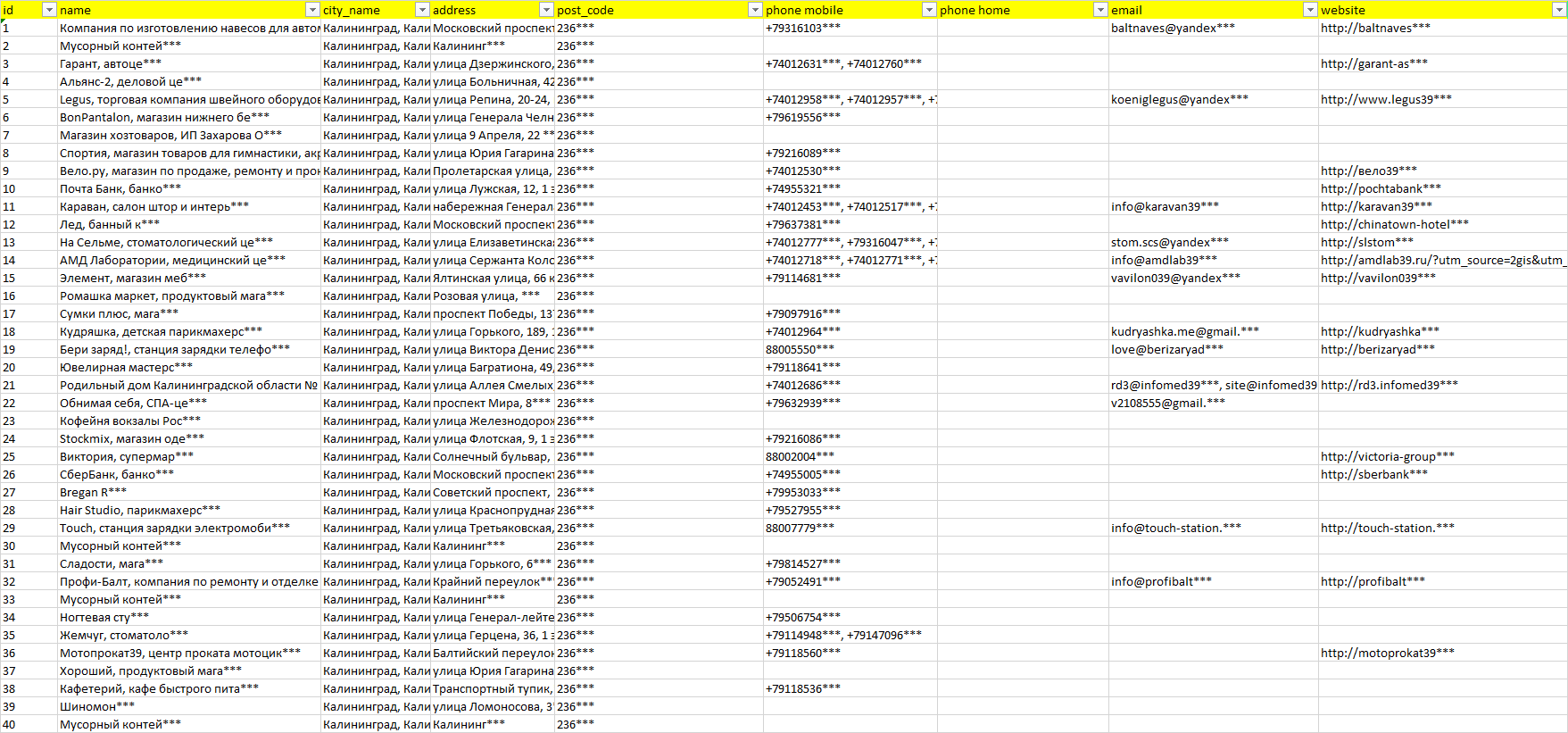 База организаций Калининград, вся Россия в формате Excel с эл. почтами, телефонами, сайтами, ссылками на соц сети, координатами и другой информацией. Скачайте демо версию, чтобы ознакомиться с данными.