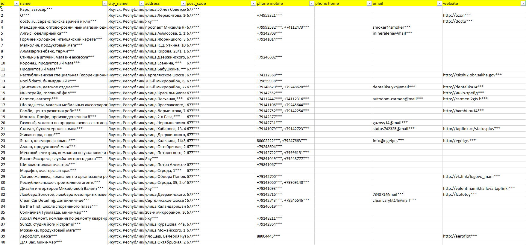 База компаний Якутск, вся РФ в формате Excel с эл. почтами, телефонами, сайтами, ссылками на соц сети, координатами и другой информацией. Скачайте демо версию, чтобы ознакомиться с данными.