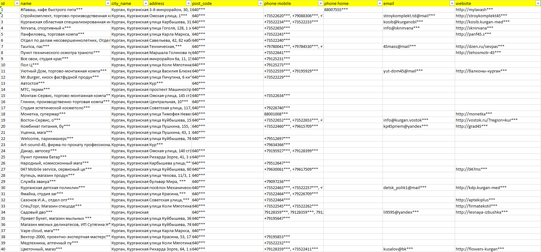 База организаций Курган, вся Россия в формате Excel с эл. почтами, телефонами, сайтами, ссылками на соц сети, координатами и другой информацией. Скачайте демо версию, чтобы ознакомиться с данными.
