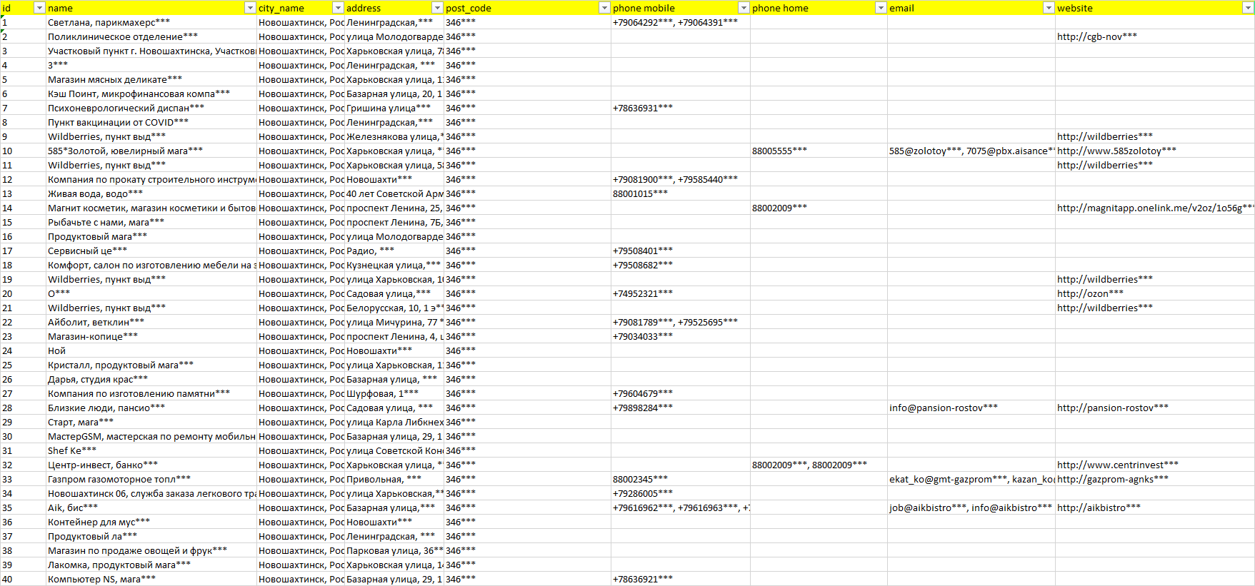 База компаний Новошахтинск, вся РФ в формате Excel с эл. почтами, телефонами, сайтами, ссылками на соц сети, координатами и другой информацией. Скачайте демо версию, чтобы ознакомиться с данными.
