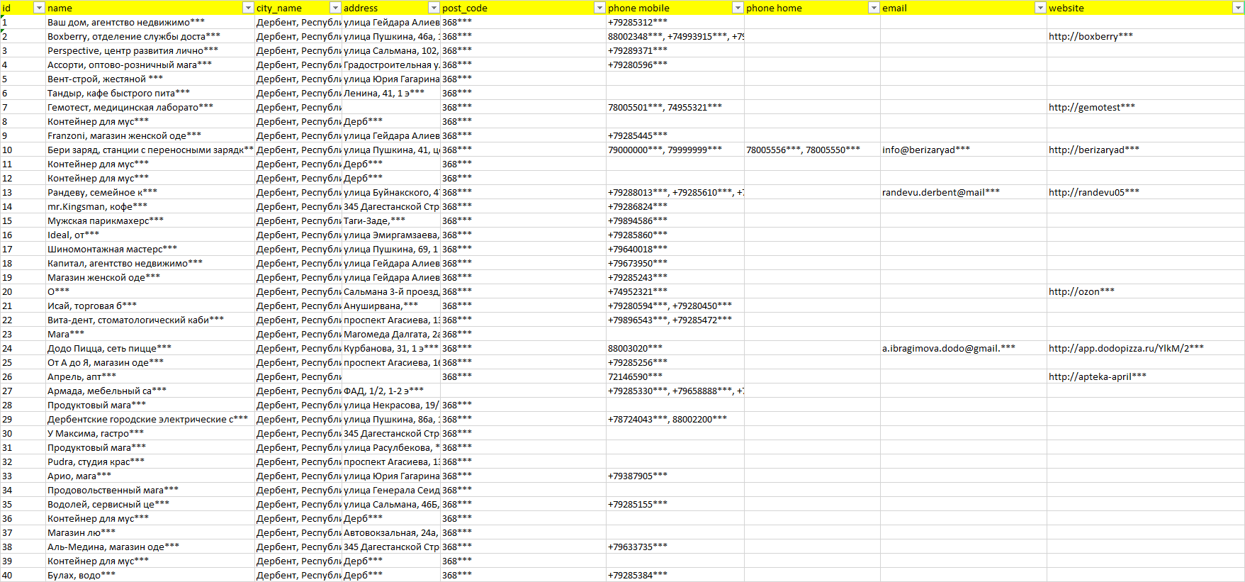 База организаций Дербент, вся Россия в формате Excel с эл. почтами, телефонами, сайтами, ссылками на соц сети, координатами и другой информацией. Скачайте демо версию, чтобы ознакомиться с данными.