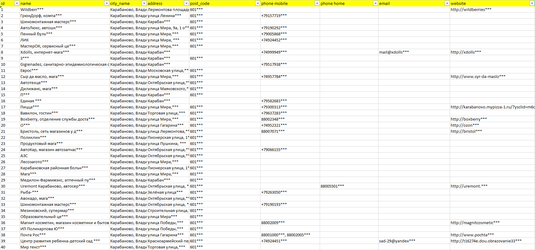 База организаций Карабаново, вся Россия в формате Excel с эл. почтами, телефонами, сайтами, ссылками на соц сети, координатами и другой информацией. Скачайте демо версию, чтобы ознакомиться с данными.
