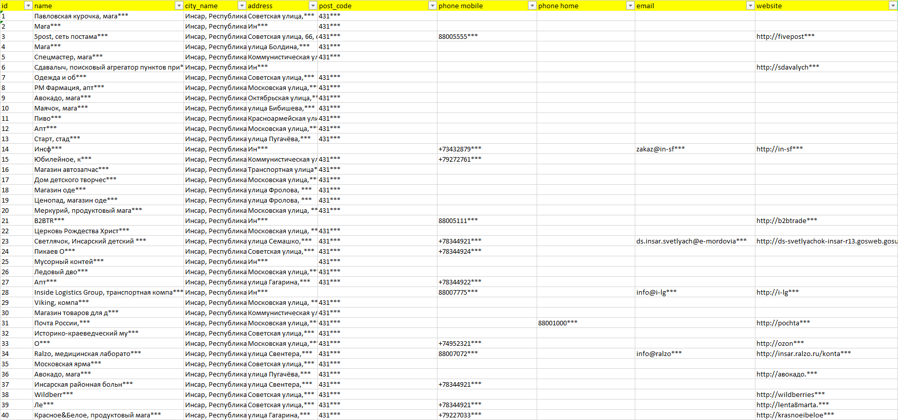 База компаний Инсар, вся РФ в формате Excel с эл. почтами, телефонами, сайтами, ссылками на соц сети, координатами и другой информацией. Скачайте демо версию, чтобы ознакомиться с данными.