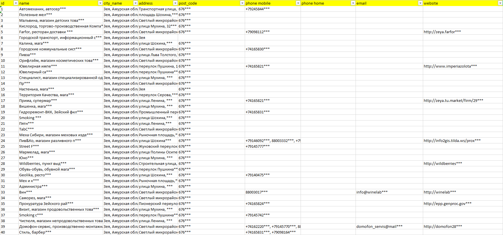 База компаний Зея, вся РФ в формате Excel с эл. почтами, телефонами, сайтами, ссылками на соц сети, координатами и другой информацией. Скачайте демо версию, чтобы ознакомиться с данными.