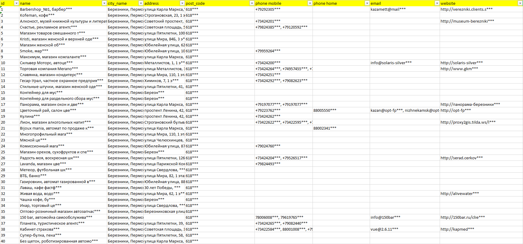 База компаний Березники, вся РФ в формате Excel с эл. почтами, телефонами, сайтами, ссылками на соц сети, координатами и другой информацией. Скачайте демо версию, чтобы ознакомиться с данными.