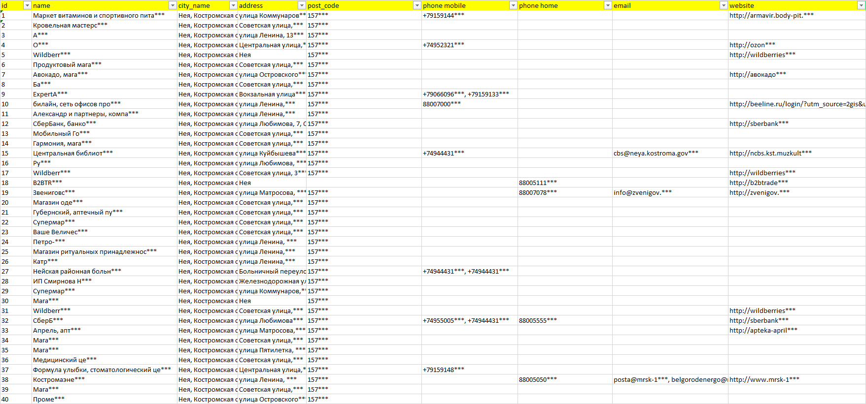 База организаций Нея, вся Россия в формате Excel с эл. почтами, телефонами, сайтами, ссылками на соц сети, координатами и другой информацией. Скачайте демо версию, чтобы ознакомиться с данными.