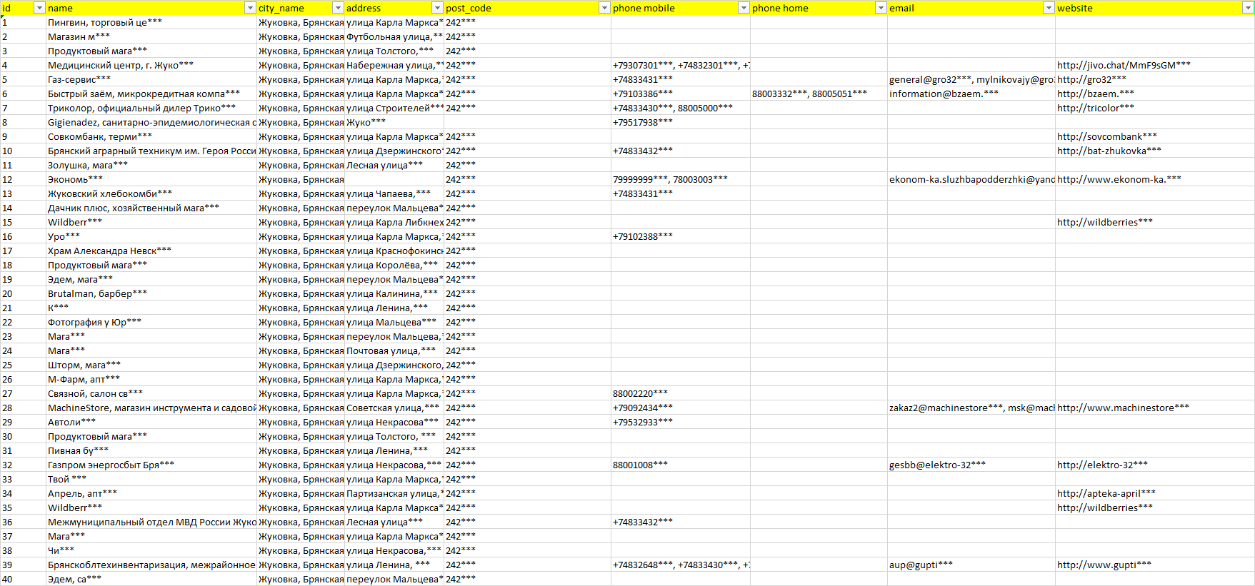 База организаций Жуковка, вся Россия в формате Excel с эл. почтами, телефонами, сайтами, ссылками на соц сети, координатами и другой информацией. Скачайте демо версию, чтобы ознакомиться с данными.