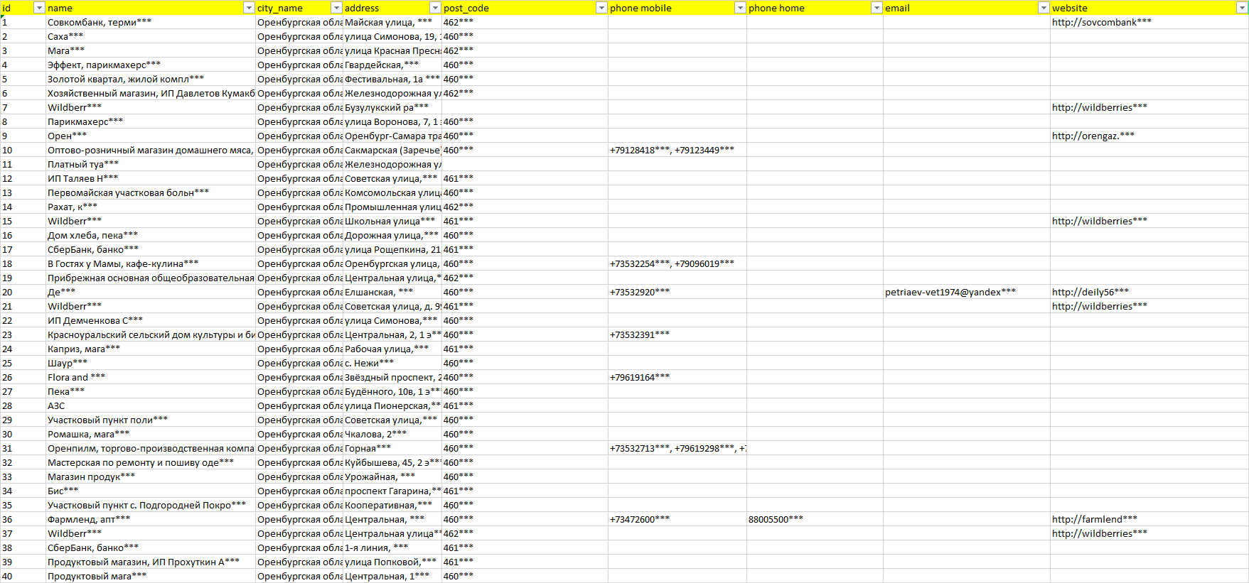 База организаций Оренбургская область, вся Россия в формате Excel с эл. почтами, телефонами, сайтами, ссылками на соц сети, координатами и другой информацией. Скачайте демо версию, чтобы ознакомиться с данными.