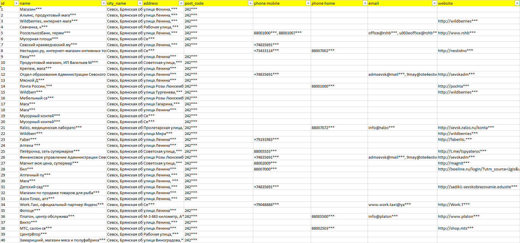 База компаний Севск, вся РФ в формате Excel с эл. почтами, телефонами, сайтами, ссылками на соц сети, координатами и другой информацией. Скачайте демо версию, чтобы ознакомиться с данными.