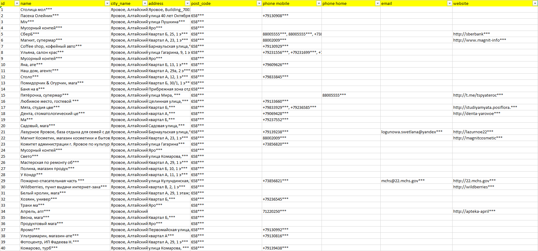 База компаний Яровое, вся РФ в формате Excel с эл. почтами, телефонами, сайтами, ссылками на соц сети, координатами и другой информацией. Скачайте демо версию, чтобы ознакомиться с данными.