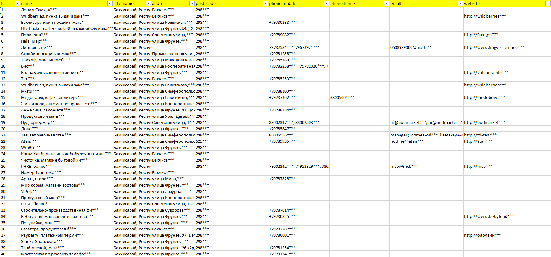 База организаций Бахчисарай, вся Россия в формате Excel с эл. почтами, телефонами, сайтами, ссылками на соц сети, координатами и другой информацией. Скачайте демо версию, чтобы ознакомиться с данными.