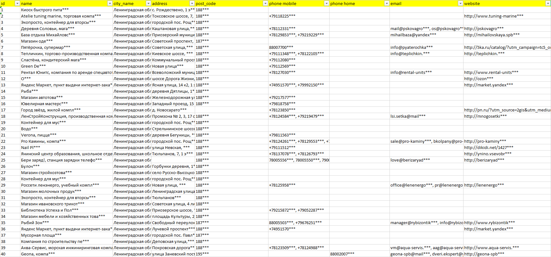 База организаций Ленинградская область, вся Россия в формате Excel с эл. почтами, телефонами, сайтами, ссылками на соц сети, координатами и другой информацией. Скачайте демо версию, чтобы ознакомиться с данными.