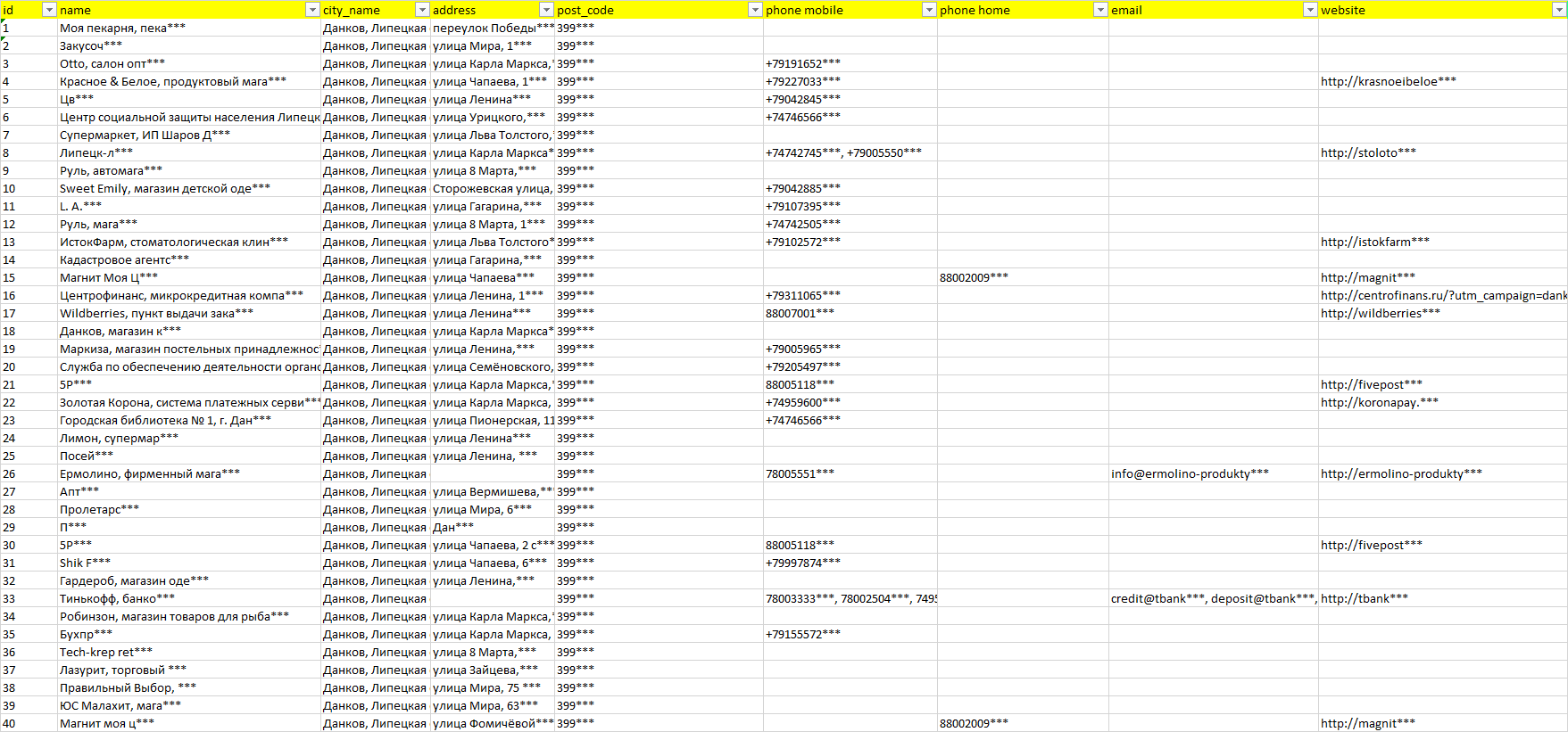 База организаций Данков, вся Россия в формате Excel с эл. почтами, телефонами, сайтами, ссылками на соц сети, координатами и другой информацией. Скачайте демо версию, чтобы ознакомиться с данными.