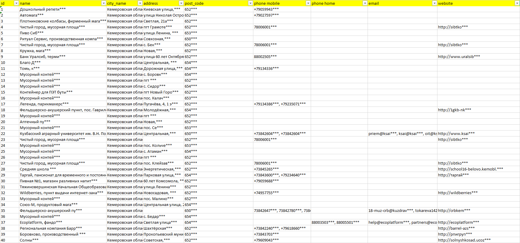 База компаний Кемеровская область — Кузбасс, вся РФ в формате Excel с эл. почтами, телефонами, сайтами, ссылками на соц сети, координатами и другой информацией. Скачайте демо версию, чтобы ознакомиться с данными.