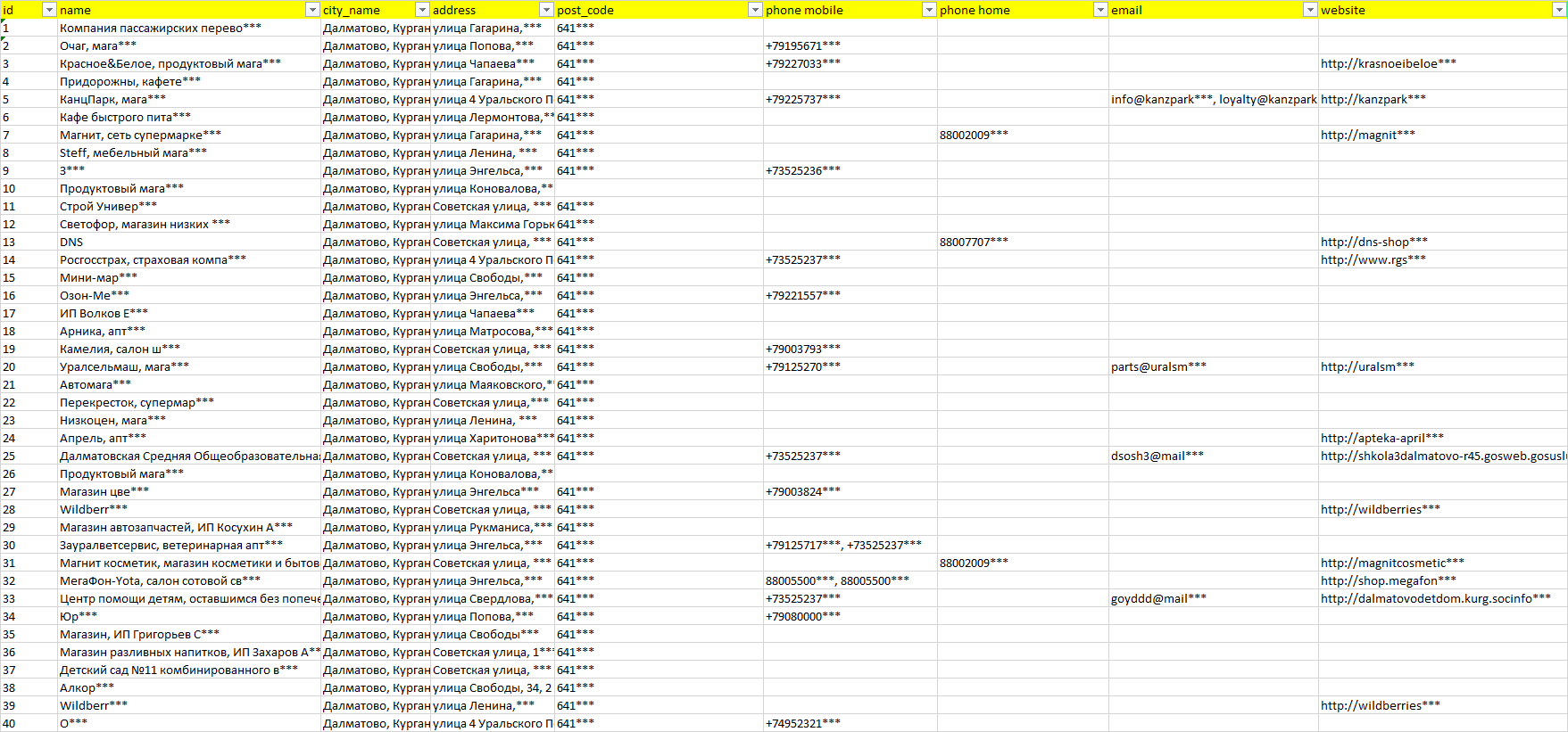 База организаций Далматово, вся Россия в формате Excel с эл. почтами, телефонами, сайтами, ссылками на соц сети, координатами и другой информацией. Скачайте демо версию, чтобы ознакомиться с данными.