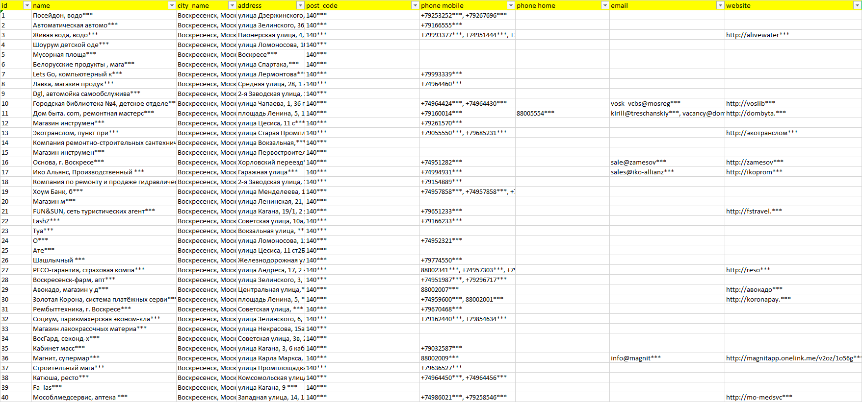База организаций Воскресенск, вся Россия в формате Excel с эл. почтами, телефонами, сайтами, ссылками на соц сети, координатами и другой информацией. Скачайте демо версию, чтобы ознакомиться с данными.