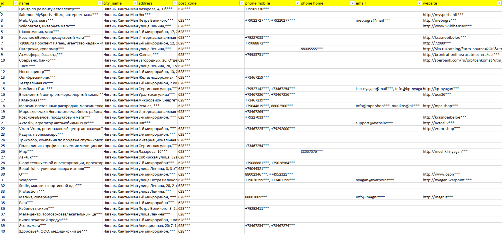 База организаций Нягань, вся Россия в формате Excel с эл. почтами, телефонами, сайтами, ссылками на соц сети, координатами и другой информацией. Скачайте демо версию, чтобы ознакомиться с данными.