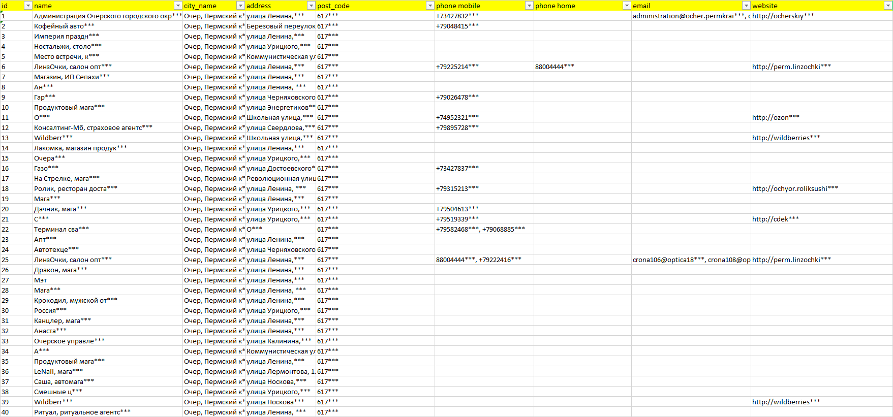 База организаций Очер, вся Россия в формате Excel с эл. почтами, телефонами, сайтами, ссылками на соц сети, координатами и другой информацией. Скачайте демо версию, чтобы ознакомиться с данными.