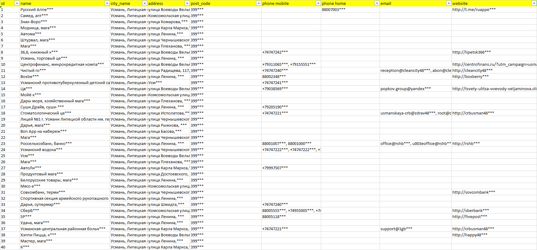 База компаний Усмань, вся РФ в формате Excel с эл. почтами, телефонами, сайтами, ссылками на соц сети, координатами и другой информацией. Скачайте демо версию, чтобы ознакомиться с данными.