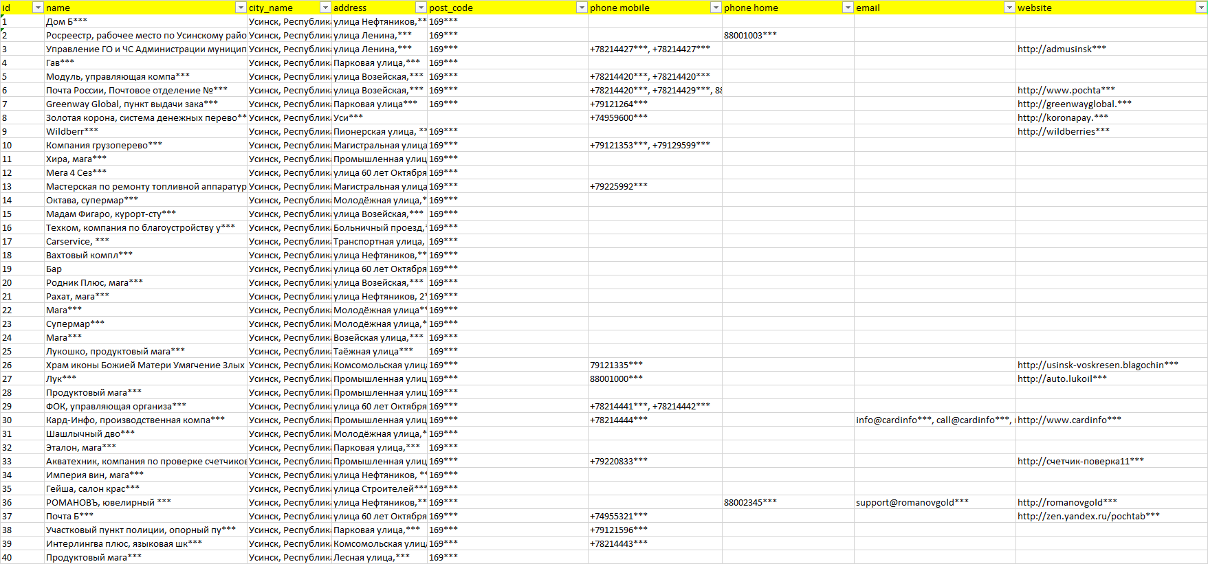 База компаний Усинск, вся РФ в формате Excel с эл. почтами, телефонами, сайтами, ссылками на соц сети, координатами и другой информацией. Скачайте демо версию, чтобы ознакомиться с данными.
