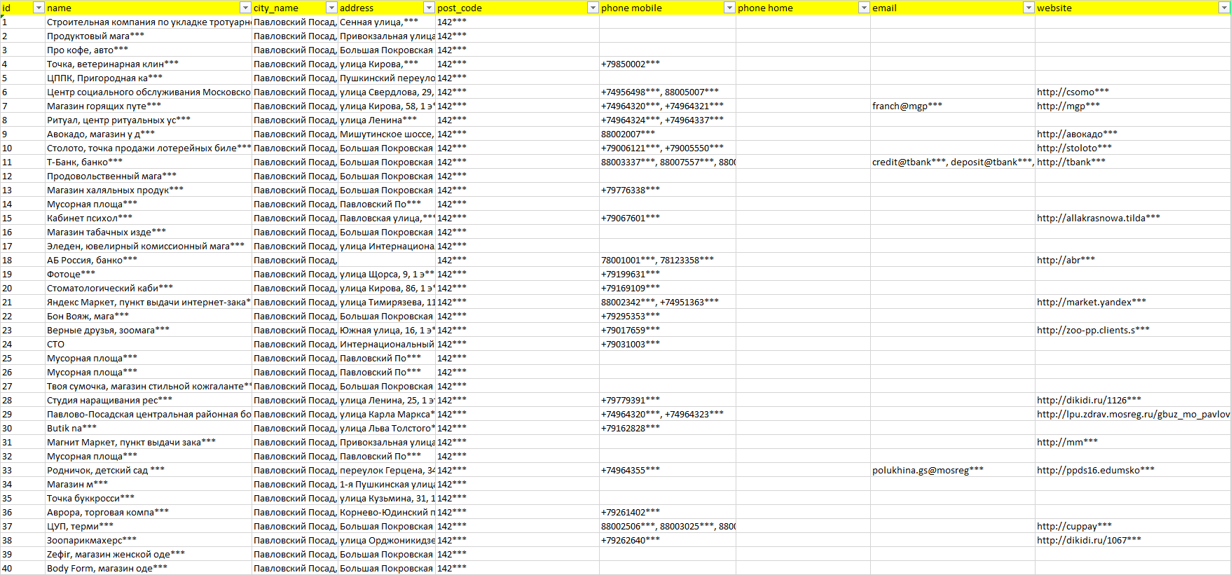 База компаний Павловский Посад, вся РФ в формате Excel с эл. почтами, телефонами, сайтами, ссылками на соц сети, координатами и другой информацией. Скачайте демо версию, чтобы ознакомиться с данными.