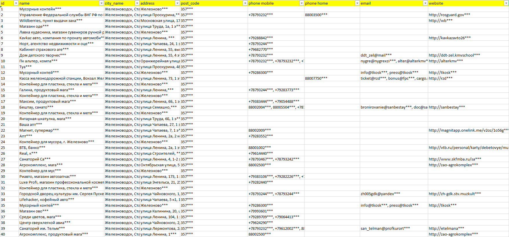 База компаний Железноводск, вся РФ в формате Excel с эл. почтами, телефонами, сайтами, ссылками на соц сети, координатами и другой информацией. Скачайте демо версию, чтобы ознакомиться с данными.