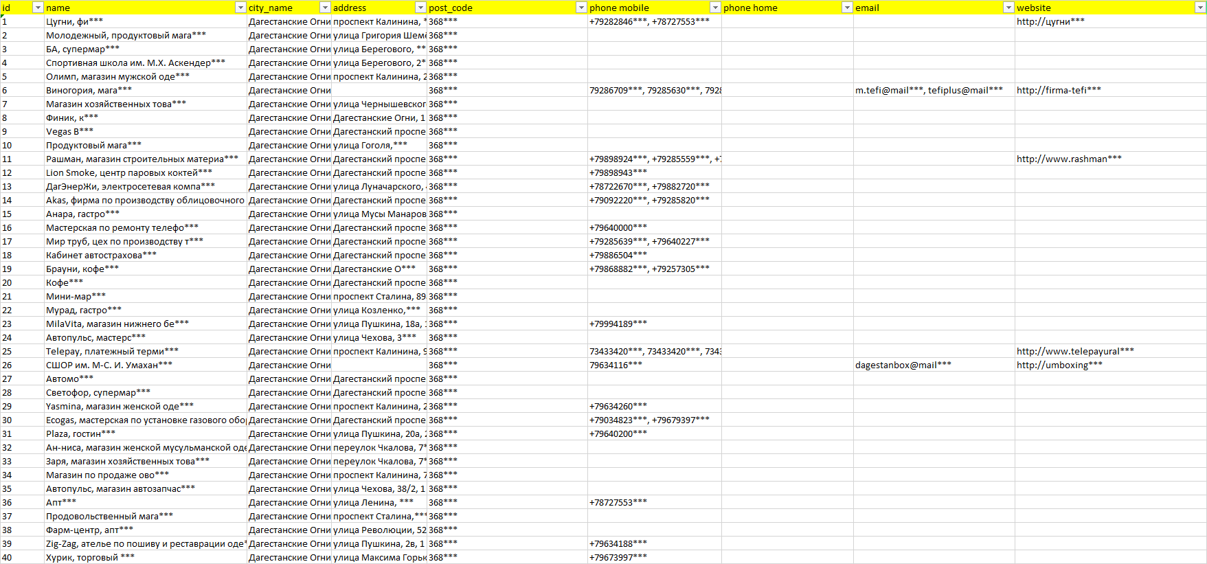 База компаний Дагестанские Огни, вся РФ в формате Excel с эл. почтами, телефонами, сайтами, ссылками на соц сети, координатами и другой информацией. Скачайте демо версию, чтобы ознакомиться с данными.