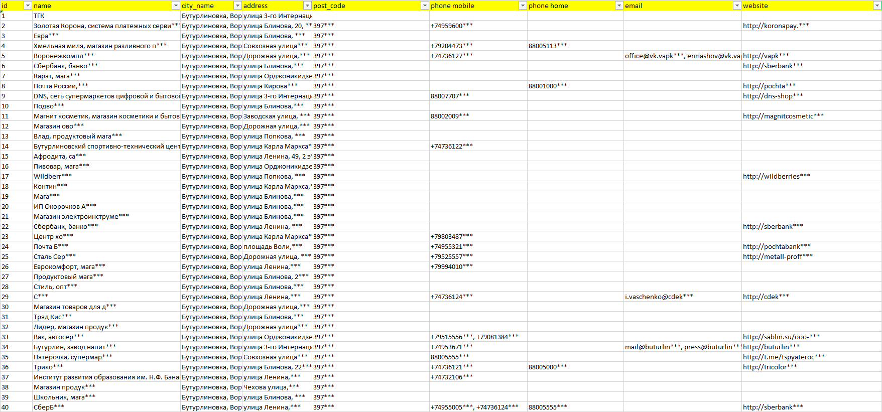 База компаний Бутурлиновка, вся РФ в формате Excel с эл. почтами, телефонами, сайтами, ссылками на соц сети, координатами и другой информацией. Скачайте демо версию, чтобы ознакомиться с данными.