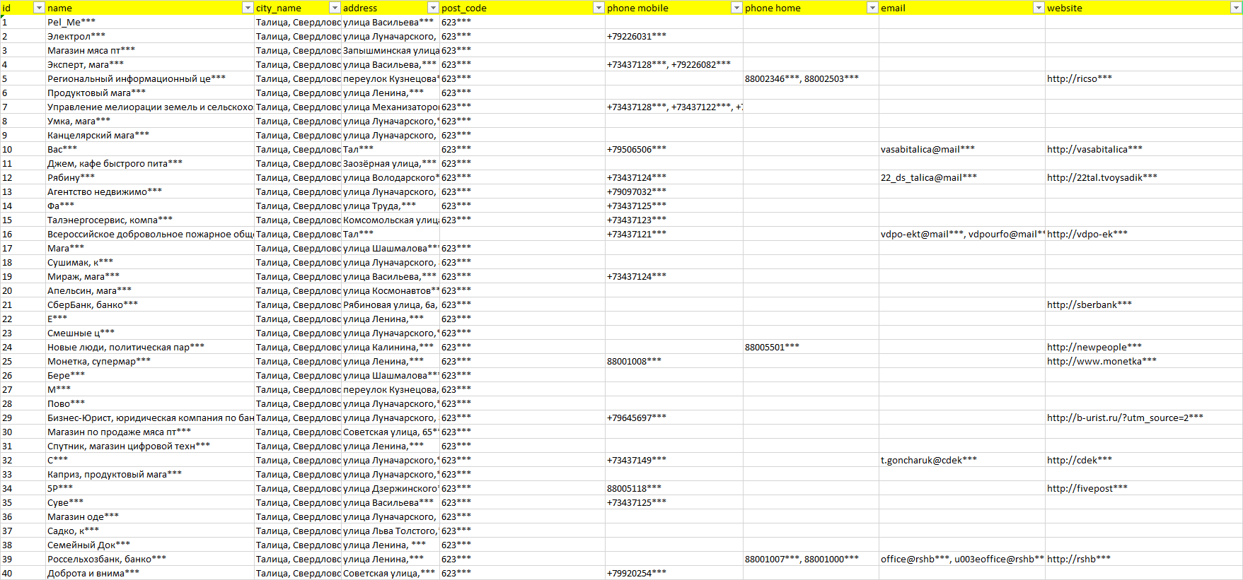 База организаций Талица, вся Россия в формате Excel с эл. почтами, телефонами, сайтами, ссылками на соц сети, координатами и другой информацией. Скачайте демо версию, чтобы ознакомиться с данными.
