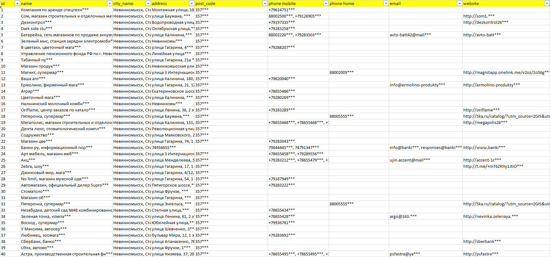 База организаций Невинномысск, вся Россия в формате Excel с эл. почтами, телефонами, сайтами, ссылками на соц сети, координатами и другой информацией. Скачайте демо версию, чтобы ознакомиться с данными.