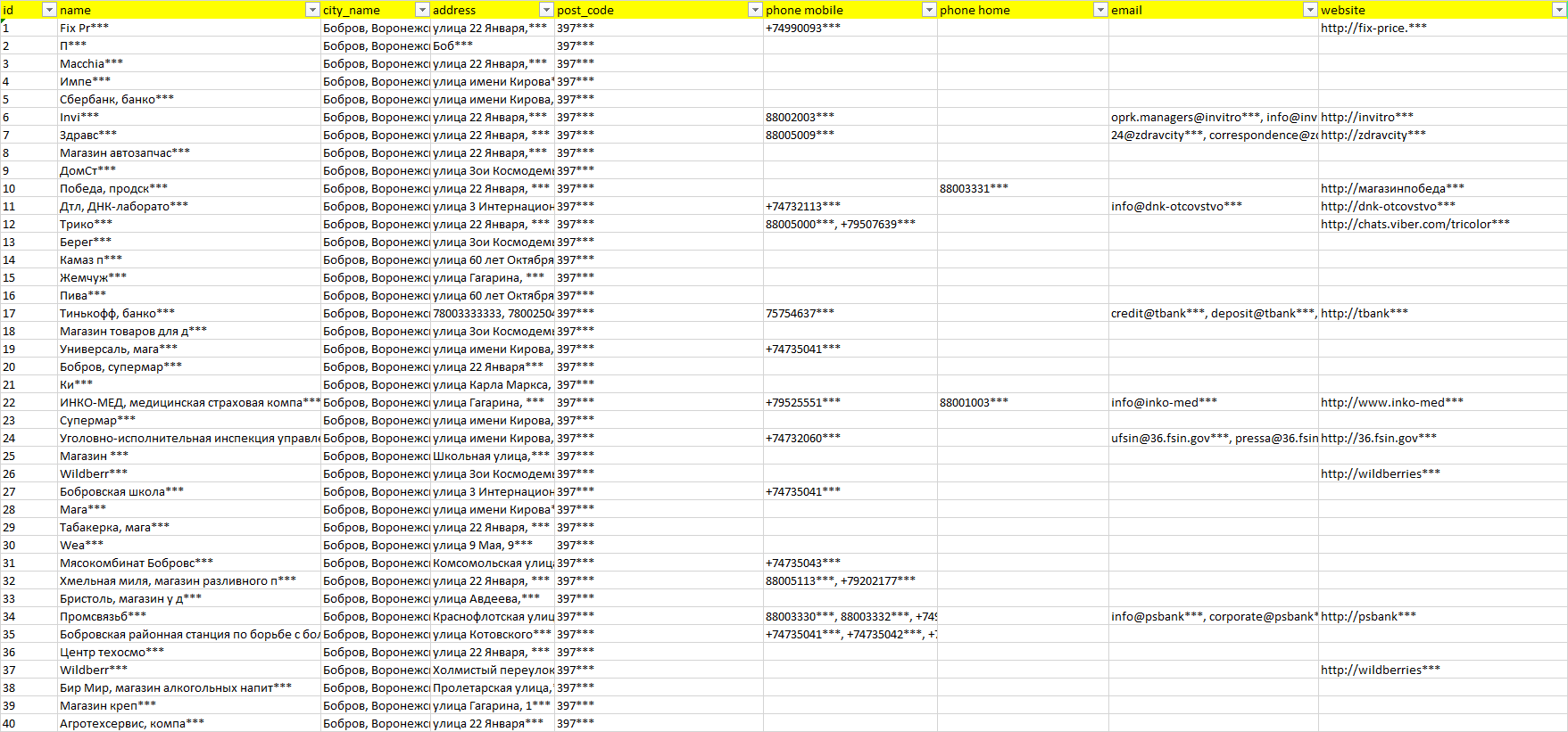 База организаций Бобров, вся Россия в формате Excel с эл. почтами, телефонами, сайтами, ссылками на соц сети, координатами и другой информацией. Скачайте демо версию, чтобы ознакомиться с данными.