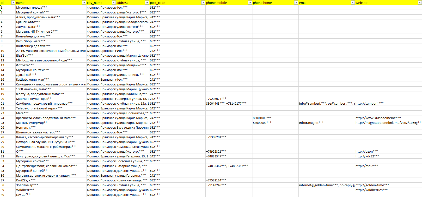 База организаций Фокино, вся Россия в формате Excel с эл. почтами, телефонами, сайтами, ссылками на соц сети, координатами и другой информацией. Скачайте демо версию, чтобы ознакомиться с данными.