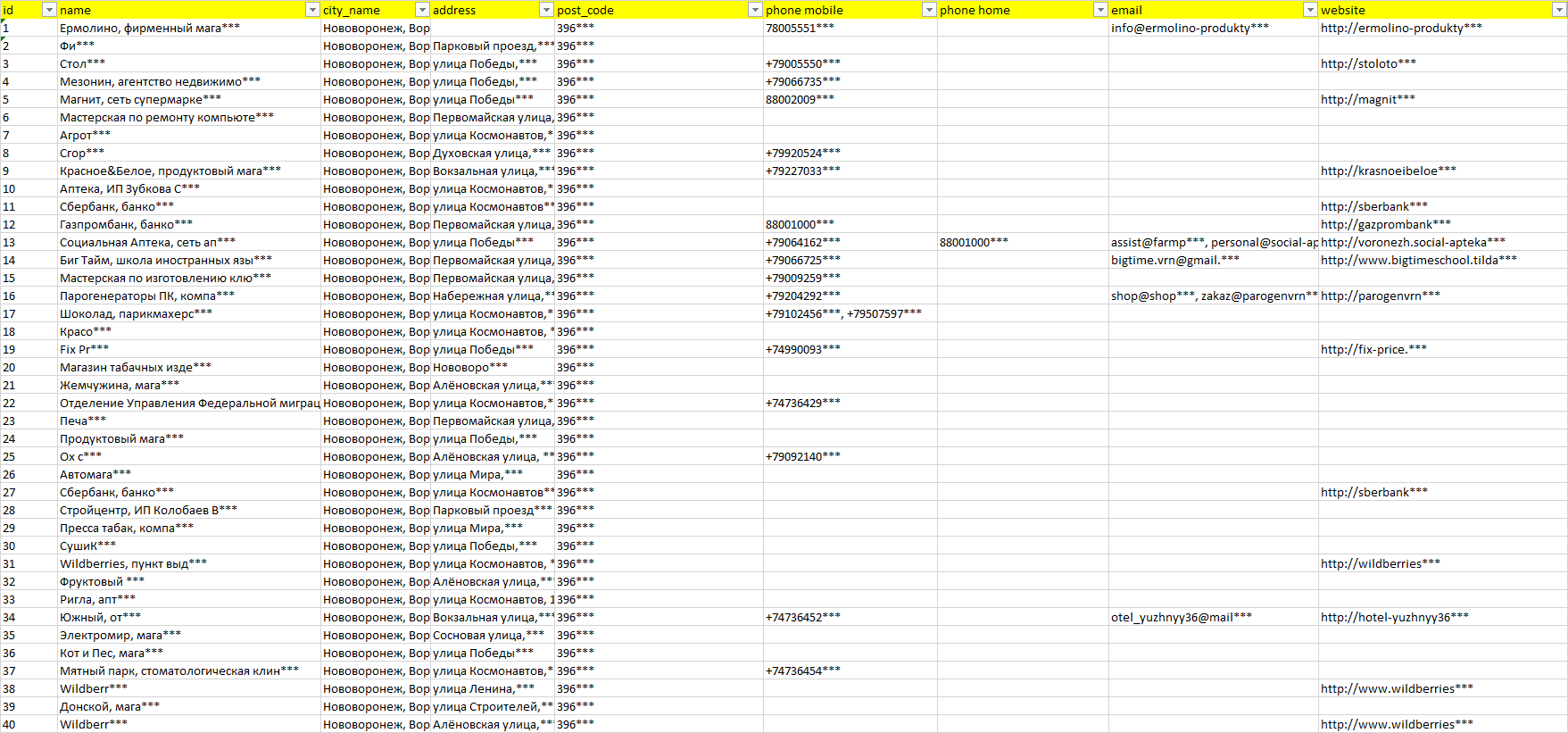База организаций Нововоронеж, вся Россия в формате Excel с эл. почтами, телефонами, сайтами, ссылками на соц сети, координатами и другой информацией. Скачайте демо версию, чтобы ознакомиться с данными.