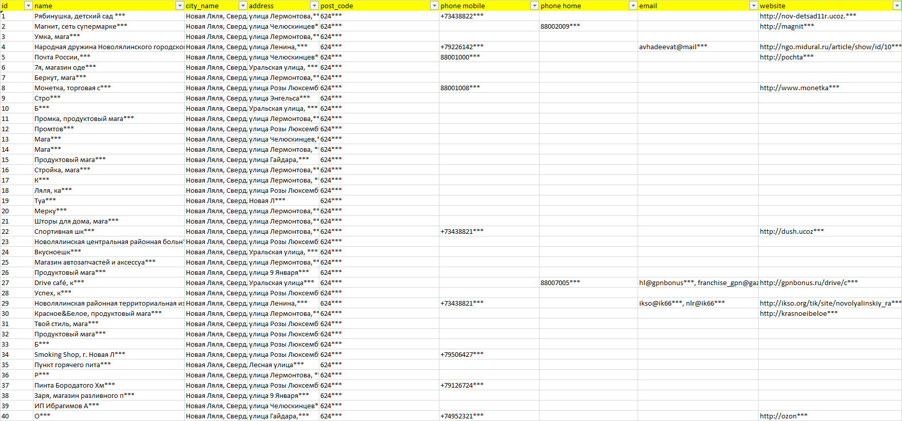 База организаций Новая Ляля, вся Россия в формате Excel с эл. почтами, телефонами, сайтами, ссылками на соц сети, координатами и другой информацией. Скачайте демо версию, чтобы ознакомиться с данными.