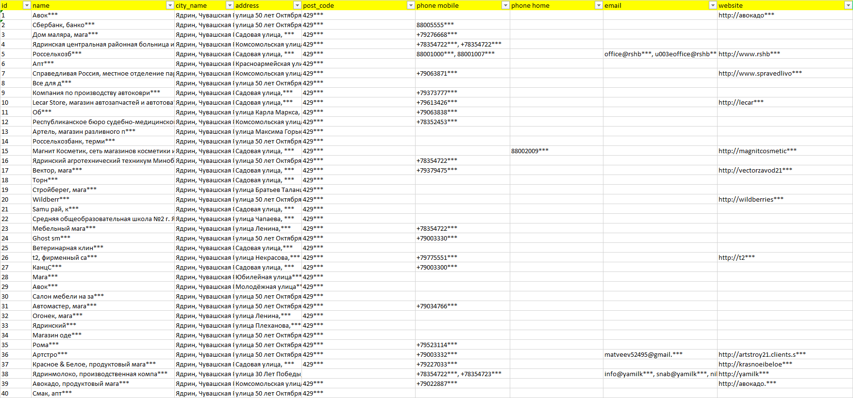 База компаний Ядрин, вся РФ в формате Excel с эл. почтами, телефонами, сайтами, ссылками на соц сети, координатами и другой информацией. Скачайте демо версию, чтобы ознакомиться с данными.
