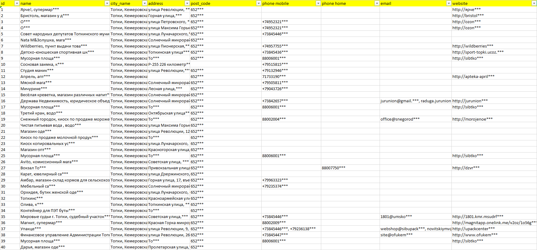 База организаций Топки, вся Россия в формате Excel с эл. почтами, телефонами, сайтами, ссылками на соц сети, координатами и другой информацией. Скачайте демо версию, чтобы ознакомиться с данными.