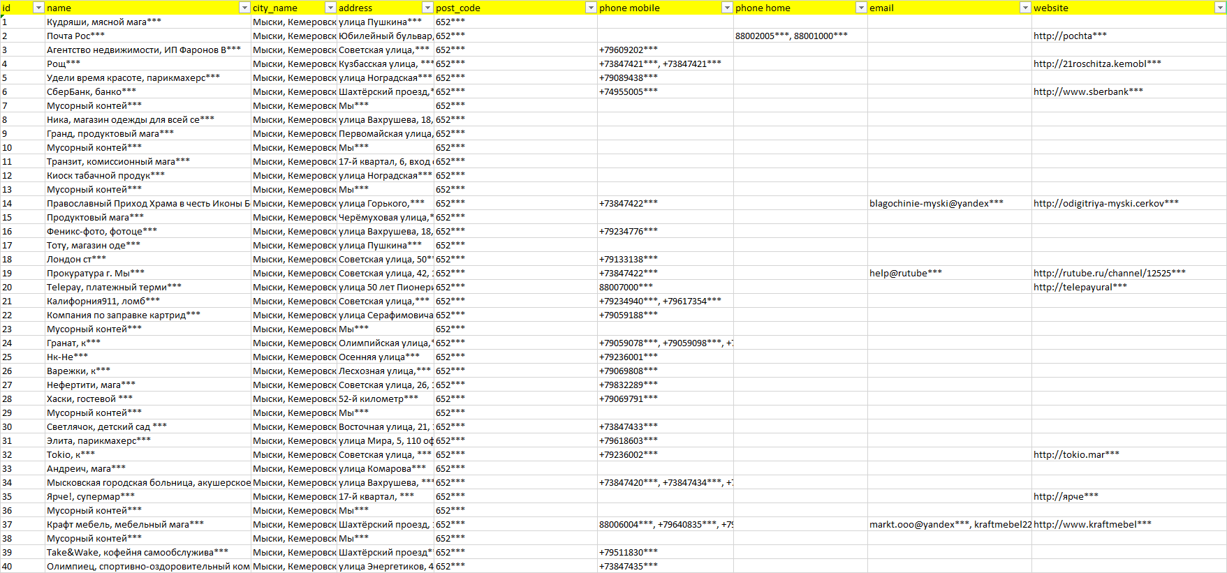 База компаний Мыски, вся РФ в формате Excel с эл. почтами, телефонами, сайтами, ссылками на соц сети, координатами и другой информацией. Скачайте демо версию, чтобы ознакомиться с данными.