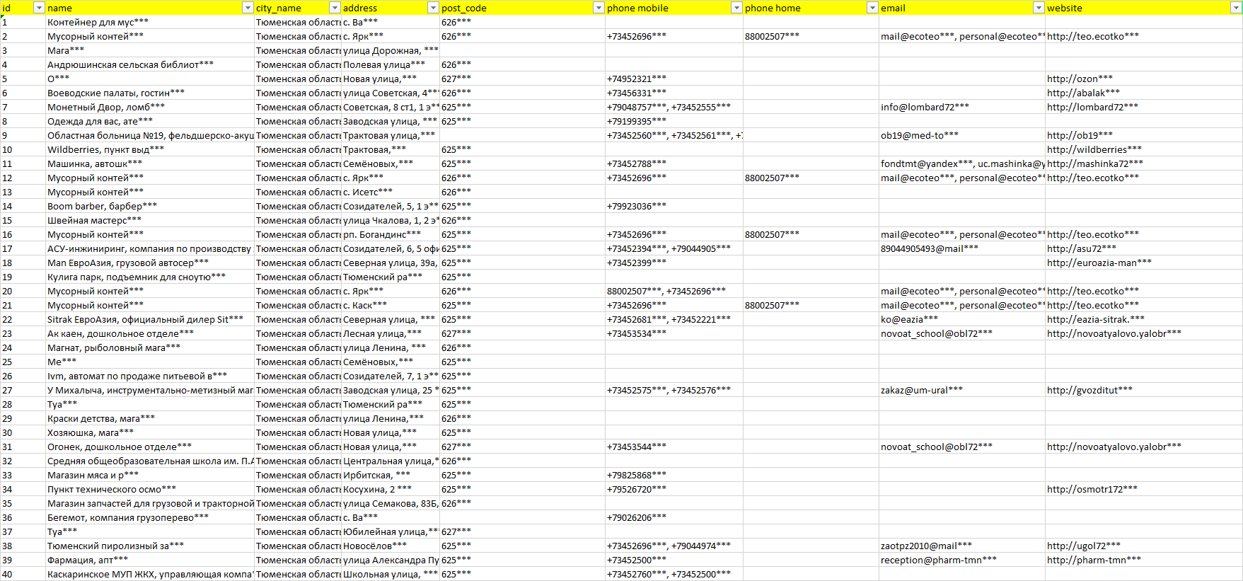 База компаний Тюменская область, вся РФ в формате Excel с эл. почтами, телефонами, сайтами, ссылками на соц сети, координатами и другой информацией. Скачайте демо версию, чтобы ознакомиться с данными.