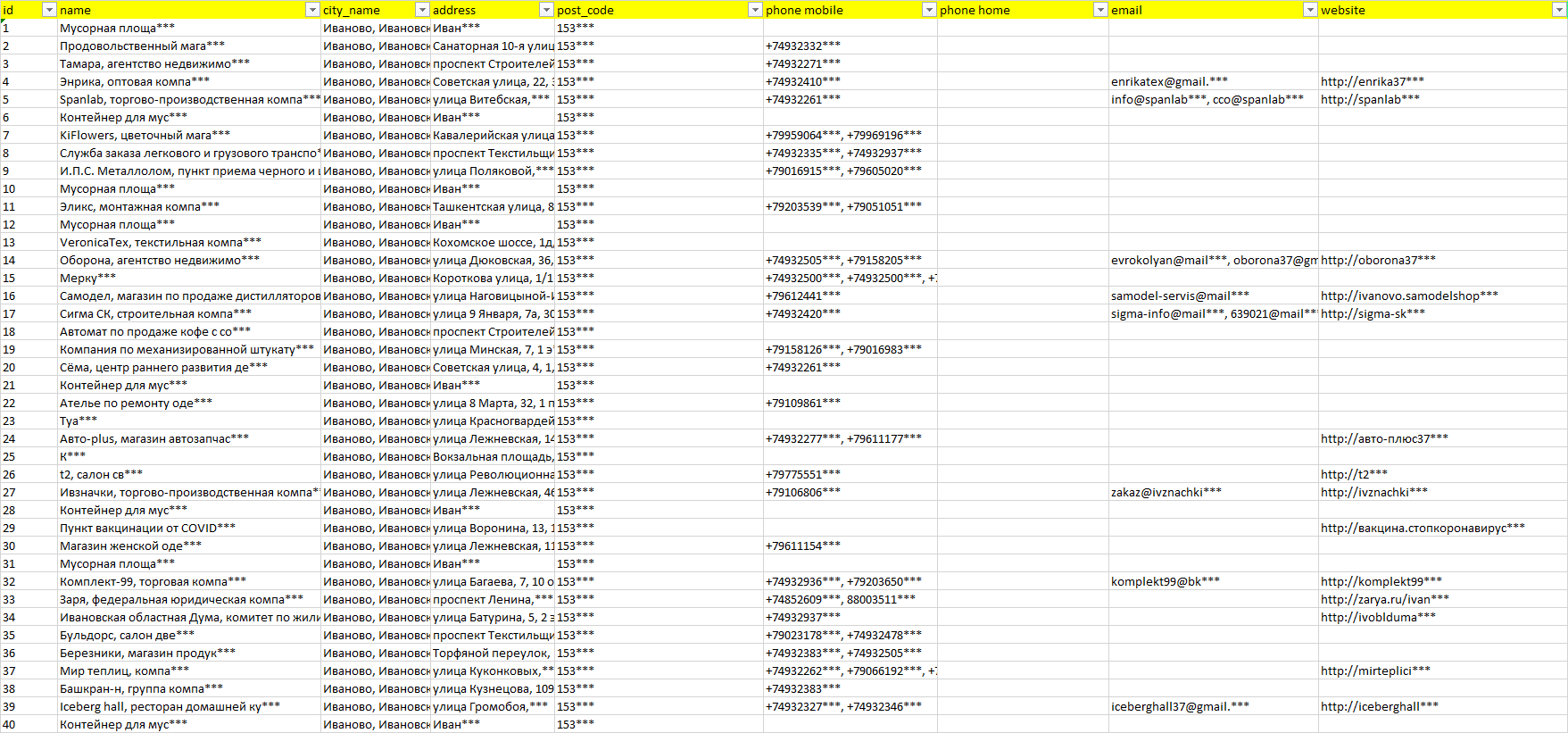База компаний Иваново, вся РФ в формате Excel с эл. почтами, телефонами, сайтами, ссылками на соц сети, координатами и другой информацией. Скачайте демо версию, чтобы ознакомиться с данными.