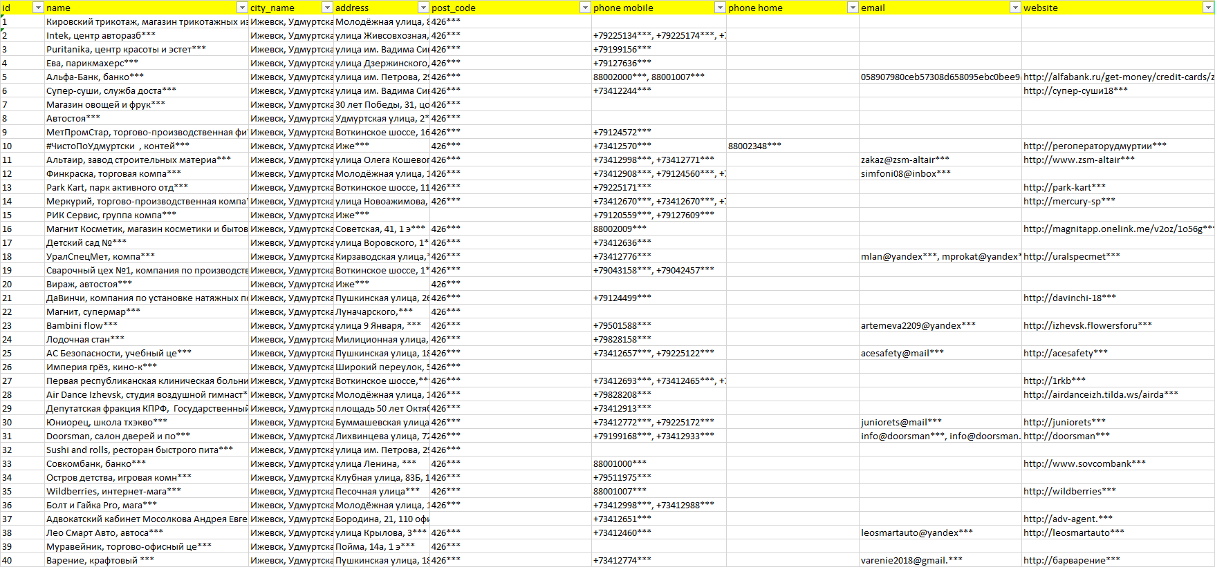 База организаций Ижевск, вся Россия в формате Excel с эл. почтами, телефонами, сайтами, ссылками на соц сети, координатами и другой информацией. Скачайте демо версию, чтобы ознакомиться с данными.