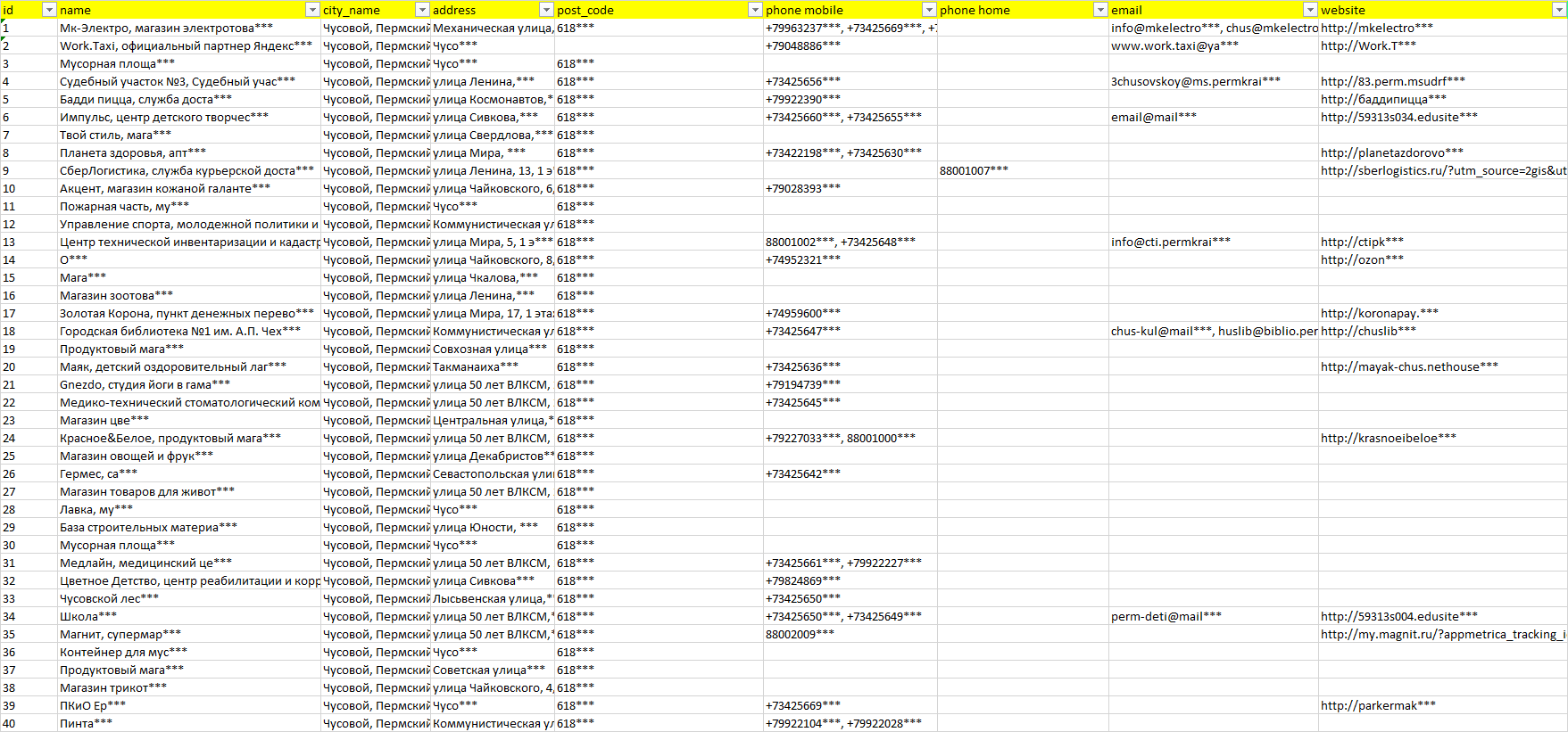 База компаний Чусовой, вся РФ в формате Excel с эл. почтами, телефонами, сайтами, ссылками на соц сети, координатами и другой информацией. Скачайте демо версию, чтобы ознакомиться с данными.