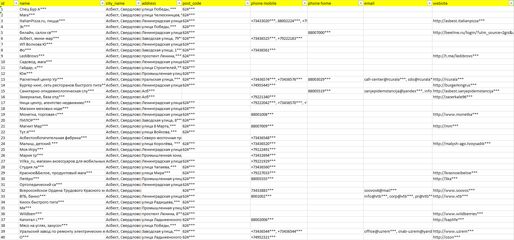 База организаций Асбест, вся Россия в формате Excel с эл. почтами, телефонами, сайтами, ссылками на соц сети, координатами и другой информацией. Скачайте демо версию, чтобы ознакомиться с данными.