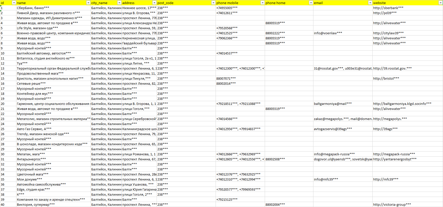 База организаций Балтийск, вся Россия в формате Excel с эл. почтами, телефонами, сайтами, ссылками на соц сети, координатами и другой информацией. Скачайте демо версию, чтобы ознакомиться с данными.
