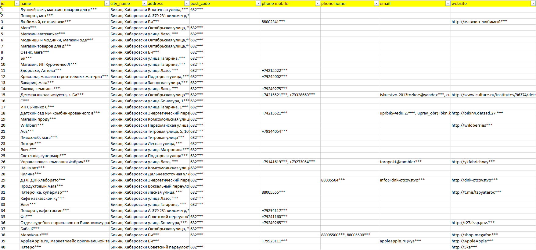База организаций Бикин, вся Россия в формате Excel с эл. почтами, телефонами, сайтами, ссылками на соц сети, координатами и другой информацией. Скачайте демо версию, чтобы ознакомиться с данными.