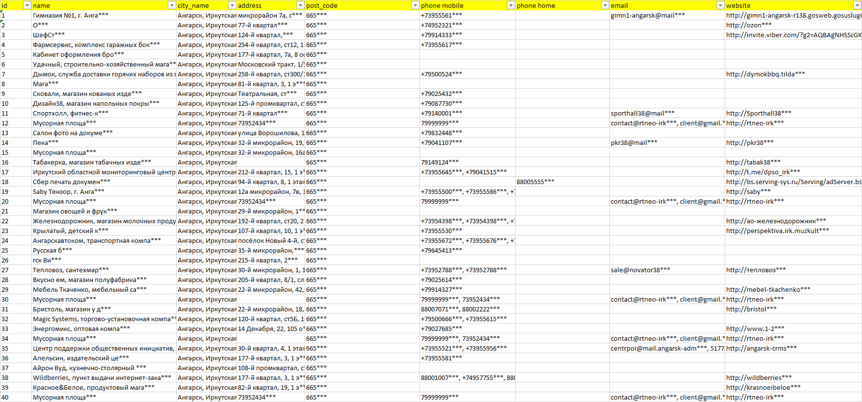 База компаний Ангарск, вся РФ в формате Excel с эл. почтами, телефонами, сайтами, ссылками на соц сети, координатами и другой информацией. Скачайте демо версию, чтобы ознакомиться с данными.