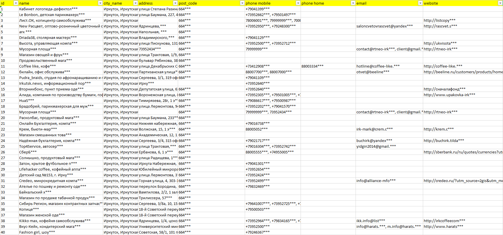 База компаний Иркутск, вся РФ в формате Excel с эл. почтами, телефонами, сайтами, ссылками на соц сети, координатами и другой информацией. Скачайте демо версию, чтобы ознакомиться с данными.