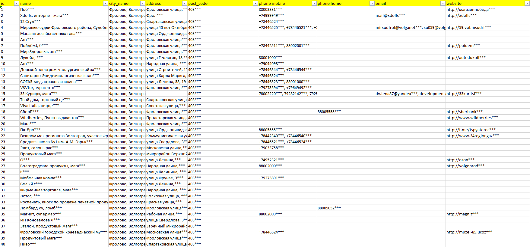 База компаний Фролово, вся РФ в формате Excel с эл. почтами, телефонами, сайтами, ссылками на соц сети, координатами и другой информацией. Скачайте демо версию, чтобы ознакомиться с данными.