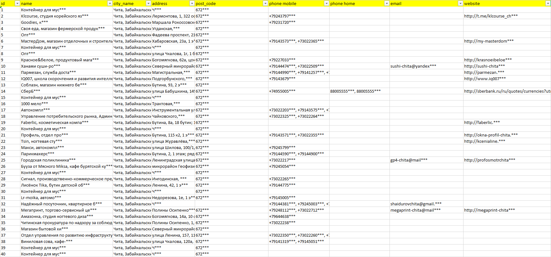 База организаций Чита, вся Россия в формате Excel с эл. почтами, телефонами, сайтами, ссылками на соц сети, координатами и другой информацией. Скачайте демо версию, чтобы ознакомиться с данными.